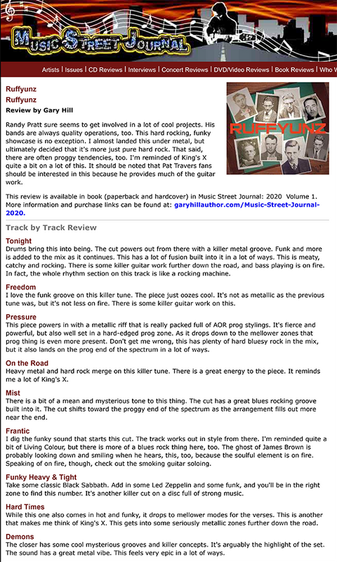 This intended one-off has turned into Randy Pratt’s new “Main Gig”. It's very uncommon for songs to be written on bass. Though these songs are credited to “Randy Pratt - Bass and effects pedals… J. Z. Barrell - engineering, co-producing and arranging… Ed Terry - vocals.“ the songs are written on bass or bass and drums, then vocals. THEN guitars are added. There’s a subtle difference in the music that this creates. This first RUFFYUNZ album has Pat Travers on every song, sparring with HYPERSPACE child prodigy Jesse Berlin. Heavy, funky, classic but hard to pin a label on. A surprise at every turn. There are 5 more “RUFFYUNZ” albums in the pipeline with an amazing array of “name” guests.