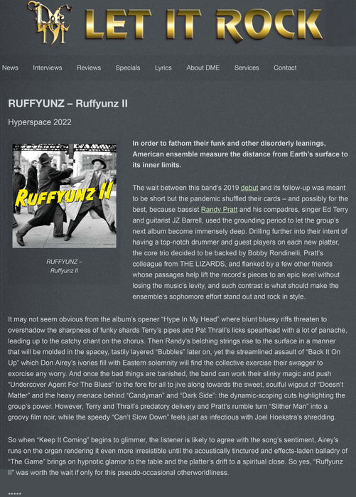 RUFFYUNZ is a partnership between Randy Pratt (Cactus/The Lizards), Emmy winning engineer JZ Barrell, and singer Ed Terry and a collection of drum, guitar and keyboard masters. Guest artists featured on the band’s new album “RUFFYUNZ II” legendary Bobby Rondinelli who dominates the drums (Black Sabbath, Rainbow, BOC), Don Airey (Deep Purple), Dave Maniketti (Y&T), Pat Thrall (Pat Travers, Glenn Hughes, Meatloaf), Tracy G. (Dio) & Joel Hoekstra (Whitesnake). The songs are mainly about sex, animalistic sex, with a couple of “Dark Dread” numbers thrown in for bad measure. “Funky, Heavy & Tight” is RUFFYUNZ credo!